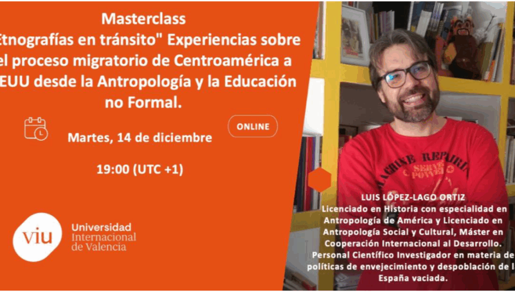 El pasado 14 de diciembre el investigador y antropólogo del 4ie+ Luis López-Lago desarrolló la Masterclass «Etnografías en tránsito. Experiencias sobre el proceso migratorio de Centroamérica a EE. UU. desde la Antropología y la Educación no Formal”. El evento se desarrolló dentro del ciclo de actividades complementarias del Grado de Trabajo Social de la Universidad Internacional de Valencia.