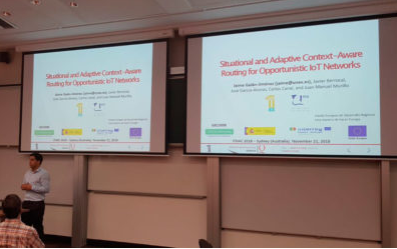 La semana pasada uno de nuestros investigadores, Jaime Galán Jiménez, viajó a Sydney, Australia, para estar presente en la conferencia 28th International Telecommunication Networks and Applications Conference, ITNAC 2018. Allí presentó el trabajo titulado «Situational and Adaptive Context-Aware Routing for Opportunistic IoT Networks», relacionado con el Proyecto 4IE.