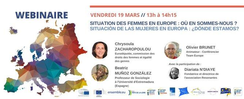 Beatriz Muñoz, profesora de Sociología en la Universidad de Extremadura e investigadora del 4ie+ participa en el webinar «Situation des femmes en Europe: où en sommes-nous? Situación de las mujeres en Europa: ¿Dónde estamos?» organizado por Europe Direct Vendée (Francia) en colaboración con Europe Direct Cáceres (España). El evento cuenta además con la participación de la eurodiputada Chrysoula Zacharopoulou, de la comisión de derechos de las mujeres e igualdad del Parlamento Europeo, Olivier Brunet, animador y conferenciante en Team Europa y Diariata N’Diaye, fundadora y directora de la asociación Resonantes.